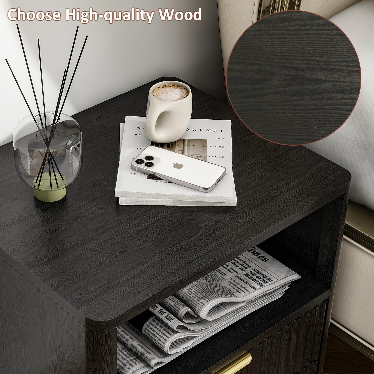 Fluted Nightstands Set of 2, Black Night Stands with 2 Drawers and Open Shelves, Wooden Bedside Table Modern Design End Table for Bedroom Sofa Office (2, Black)