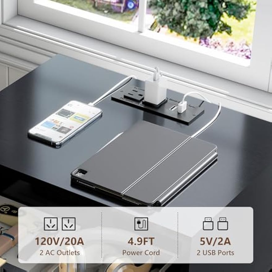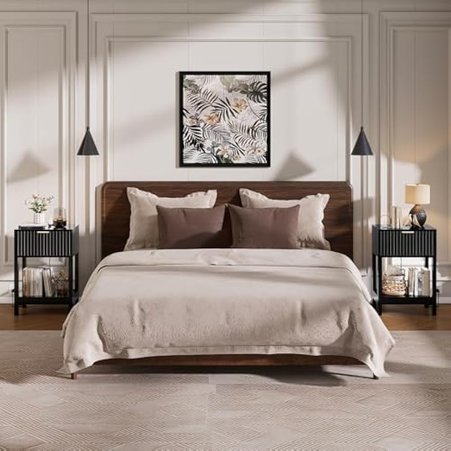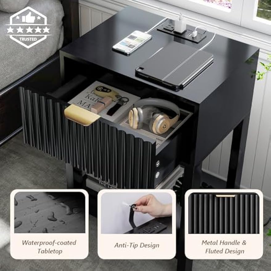 Night Stand Set 2, Fluted Nightstand with Charging Station, Wood Bedside Table with Drawer & Storage Shelf, Modern End Tables for Bedroom Sofa Couch Office, Black