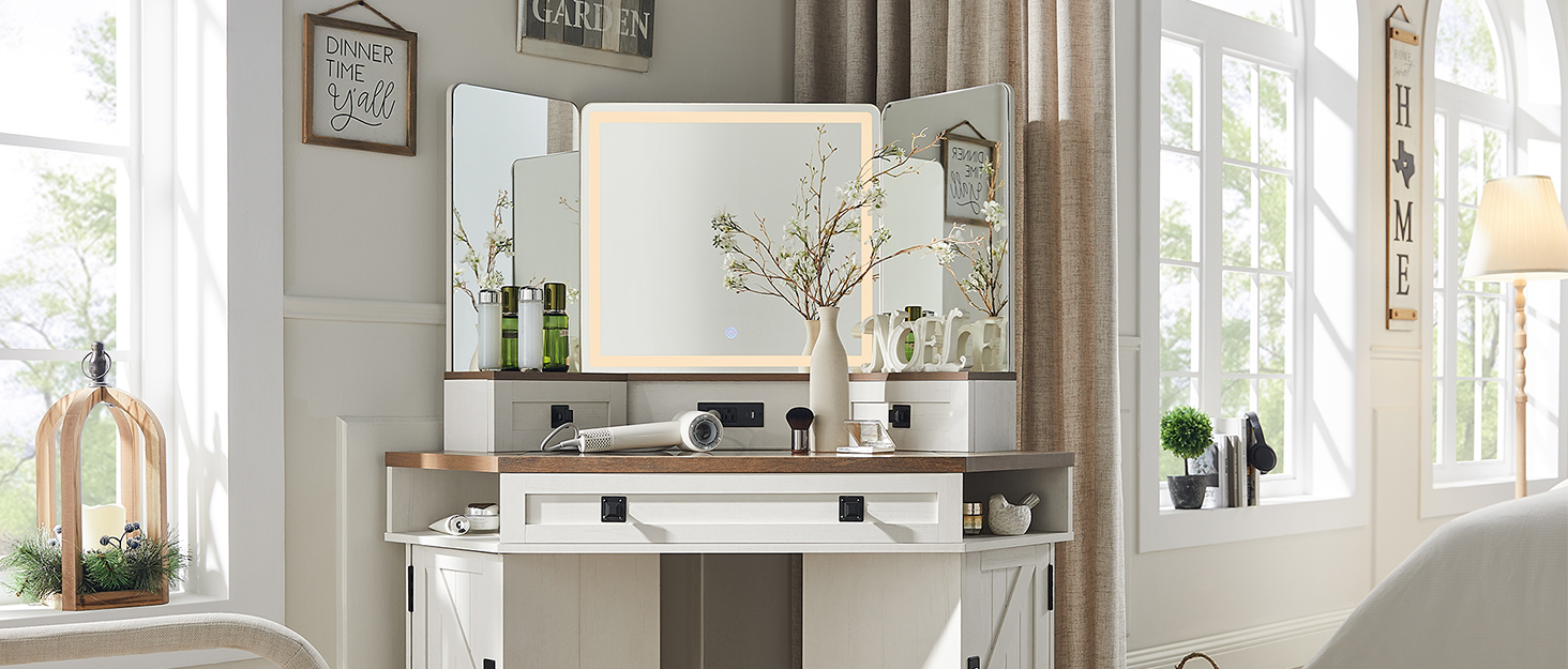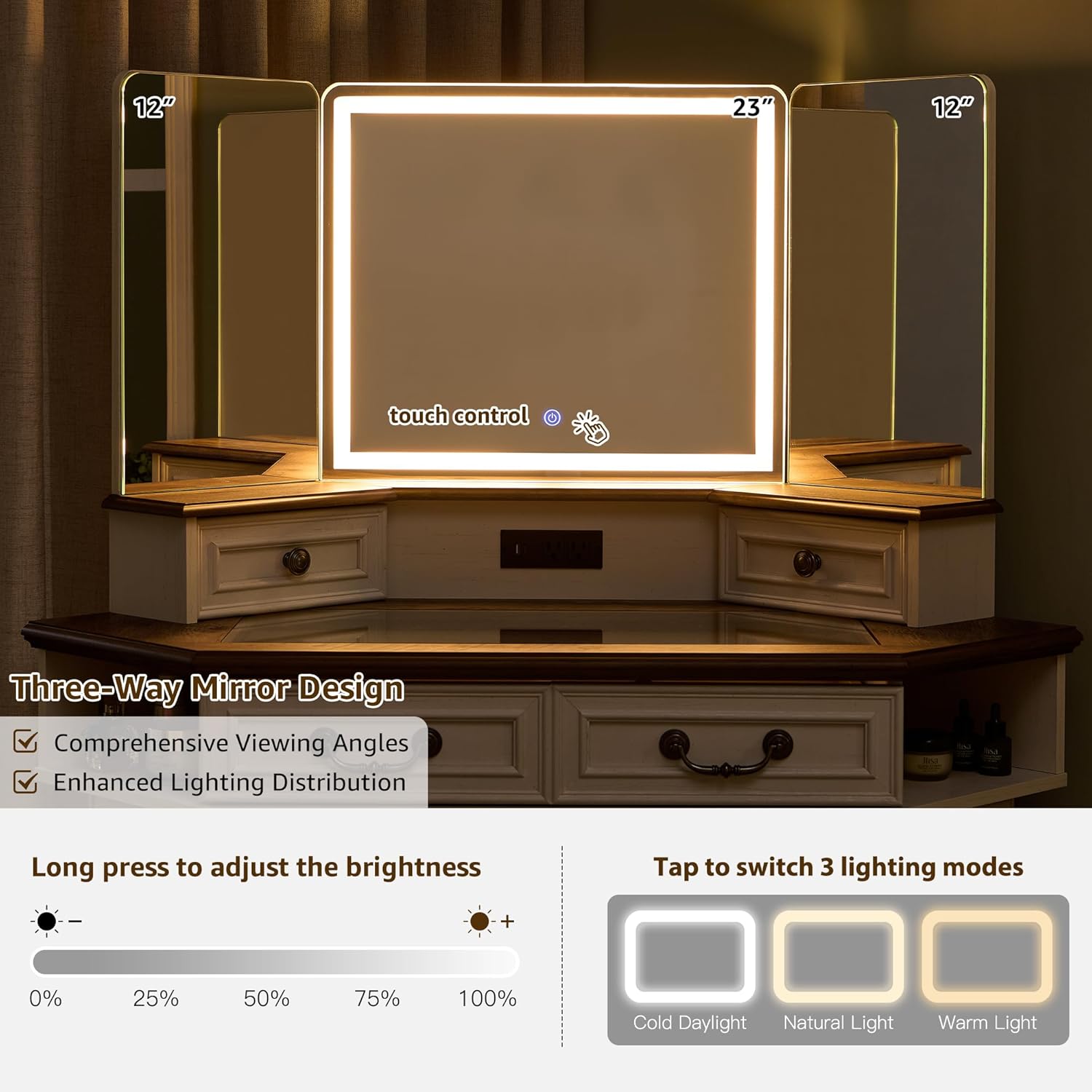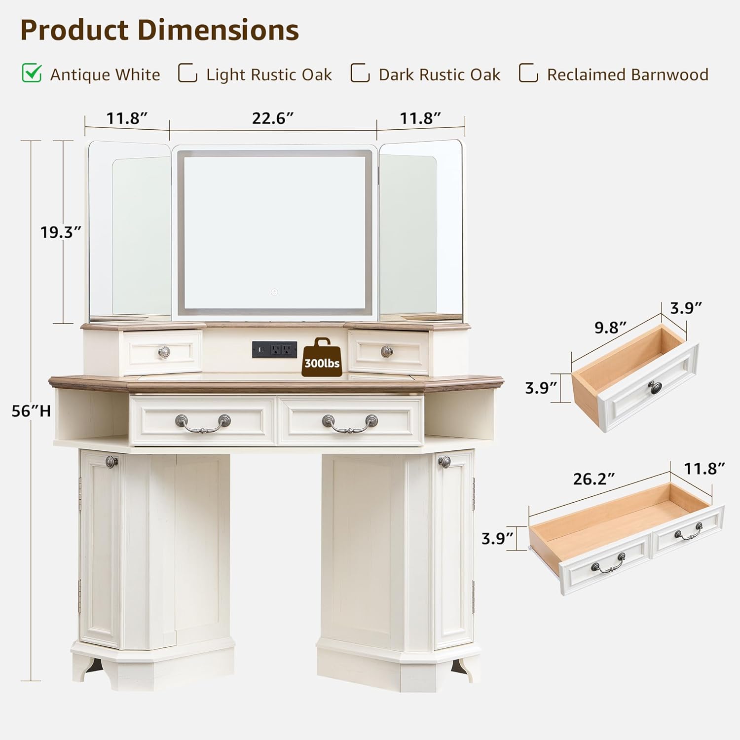 T4TREAM Makeup Vanity Desk 48" with 3 Way Mirror and Lights, Large Farmhouse Corner Vanity Dressing Table with Glass Top & Charging Station, 3 Drawers & 2 Storage Cabinets for Bedroom, Antique White