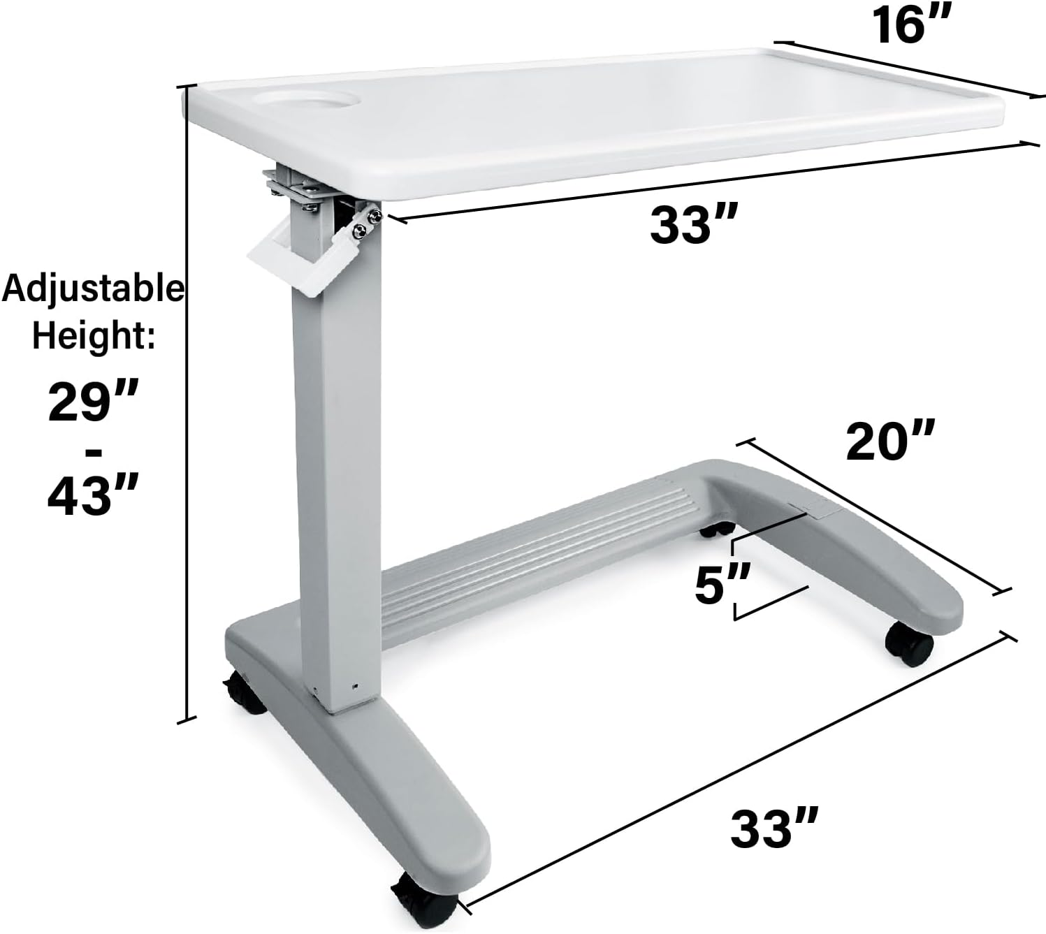 Vaunn Medical Adjustable Overbed Exam Bedside Table with Wheels (Hospital and Home Use), New Tabletop, Light Gray